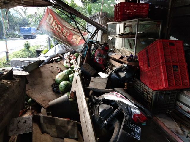 Akibat kejadian tersebut, warung buah rusak dan roboh. Selain itu, dua unit sepeda motor yang terparkir di depan warung juga menjadi korban. Sepeda motor Beat dan Mio rusak. Kerugian akibat kecelakaan tersebut diperkirakan mencapai Rp7 juta. (ka)