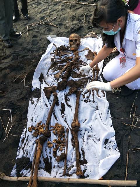 Saat di temukan kerangka yang terbungkus kain kapan warna putih dan posisi kerangka terlentang dengan posisi kepala di utara. Kedalaman posisi dibagian kepala sedalam 70 cm dari permukaan tanah. Kedalaman kaki dari permukaan tanah 60cm. Terdapat 4 ikatan tali plastik rapia warna hijau yaitu terikat pada bagian kepala, dada, pinggang dan kaki.