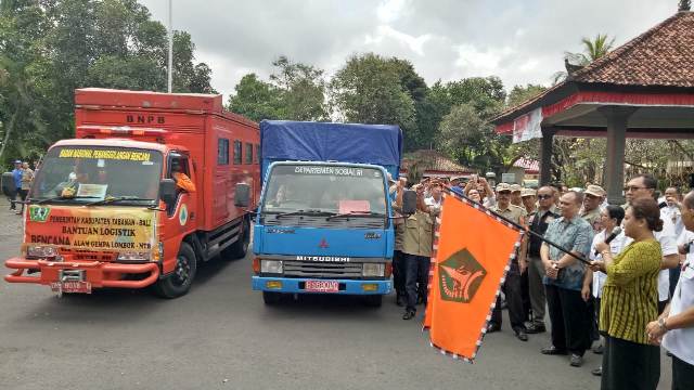 Bantuan disalurkan secara resmi, ditandai dengan pelepasan 2 truk bantuan yang mengangkut berupa bantuan logistick berupa makanan dan sembako, serta uang tunai dari Pemkab Tabanan disalurkan melalui BPBD dan Tagana Dinas Sosial Kabupaten Tabanan, dengan total bantuan sekitar Rp.100 Juta, yang di lepas oleh Bupati Tabanan Ni Putu Eka Wiryastuti, Rabu (5/8/2018).