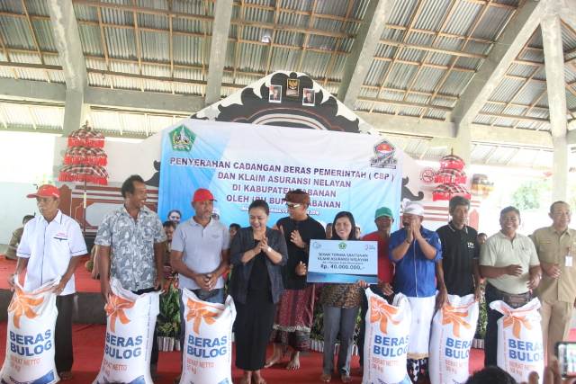 TABANAN, MEDIAPELANGI.com – Bupati Tabanan Ni Putu Eka Wiryastuti menyerahkan 23,049 Ton Cadangan Beras Pemerintah (CBP) kepada 73 kelompok nelayan dengan total jumlah nelayan sebanyak 1101 nelayan, Selasa (25/9/2018) di Wantilan Desa Pakraman Tibubiu, Kerambitan, Tabanan. Penyerahan CBP ini merupakan yang ke-6 kalinya di Tabanan. Penyerahan CBP juga dirangkaikan dengan penyerahan klaim asuransi nelayan.