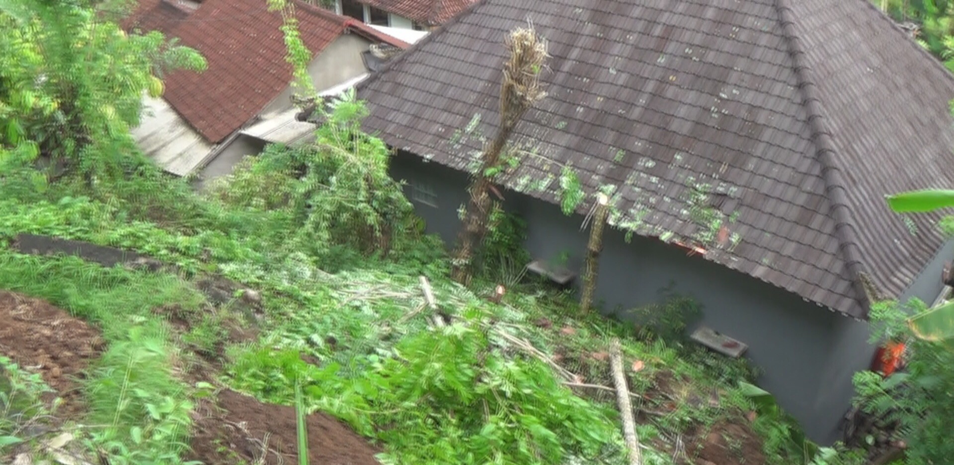 Bencana tanah longsor yang terjadi akibat dari senderan rumah burung walet setinggi 10 meter menimpa bangunan belakang rumah Ni Ketut Suciati.