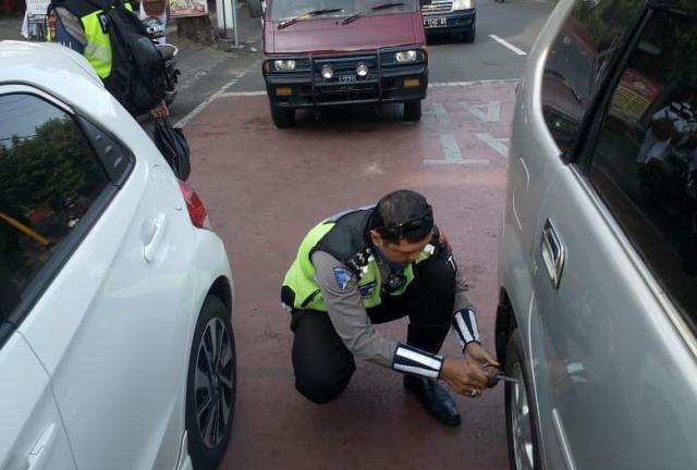 Dengan cara mengembok kendaraan yang salah parkir dan menempel kertas di kaca kendaraan.