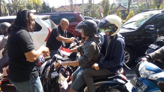 Sebanyak 178 buah bendera merah putih dibagikan secara gratis kepada pengendara sepeda motor yang tidak pakai bendera melintas di Jalan Pahlawan, Tabanan