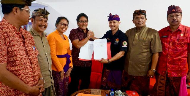Penyerahan NPHD oleh Bupati Badung kepada KPU Kabupaten dan Bawaslu Kabupaten Badung, disaksikan langsung oleh Kepala Badan Kesbangpol Badung, I Nyoman Suendi.