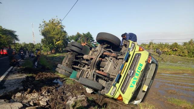 Sebanyak 23 ton muatan pakan ternak itu jatuh ke areal sawah disebelah kiri jalan utama untuk menghindari kendaraan lain dari arah berlawanan.