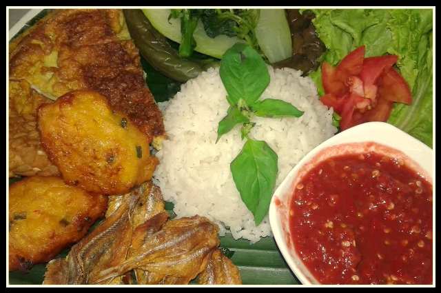 Nasi putih hangat dengan potongan tahu dan tempe serta ikan asin yang garing, terasa sangat nikmat dengan rasa sambalnya yang pedas-asam nan segar. Belum lagi dengan sayuran rebusnya yang masih garing dan manis.