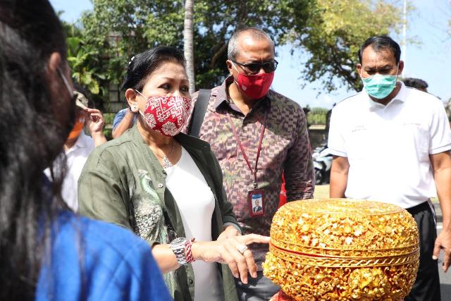 Di hadapan penjaga sejumlah stand di arena pasar gotong royong, perempuan yang dikenal sebagai penyair berbakat itu memuji kreativitas yang ditunjukkan para perajin Bali. Pujian tersebut antara lain ditujukan kepada desainer Dayu Karang yang memadukan karya busana dengan sentuhan pis bolong (uang kepeng).