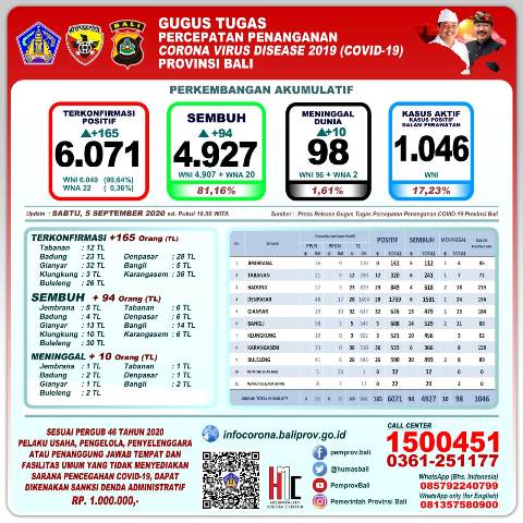 Secara KUMULATIF, kasus Terkonfirmasi Positif menjadi 6.071 orang, Sembuh 4.927 orang (81,16%) dan pasien Meninggal Dunia menjadi 98 orang (1,61%).