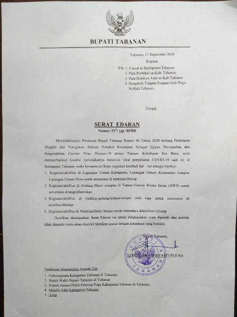 Surat Edaran (SE) nomor : 517/120/BPBD ditujukan kepada camat se kabupaten Tabanan, Perbekel, Bendesa Adat maupun pengelola gedung atau tempat olahraga.