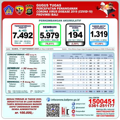 TERKONFIRMASI sebanyak 63 orang melalui Transmisi Lokal, SEMBUH sebanyak 92 orang, dan Meninggal Dunia sebanyak 6 orang. Jumlah kasus secara kumulatif sebagai berikut :