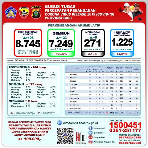 DENPASAR, MEDIAPELANGI.com – Perkembangan Pandemi Covid-19 di Provinsi Bali per hari, Selasa (29/9/2020) mencatat pertambahan kasus : TERKONFIRMASI sebanyak 106 orang melalui Transmisi Lokal, SEMBUH sebanyak 123 orang, dan Meninggal Dunia sebanyak 8 orang.