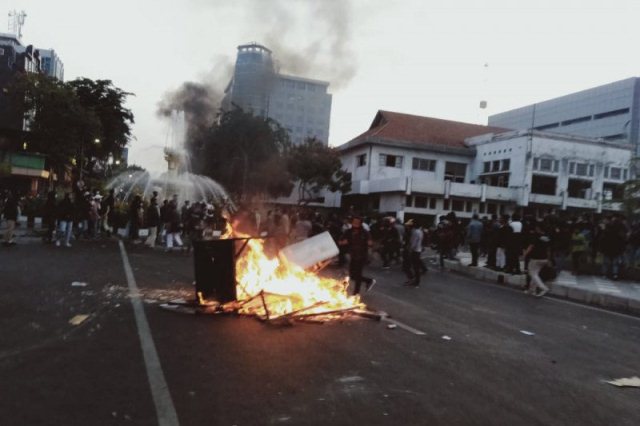 SURABAYA, MEDIAPELANGI.com – Sejumlah fasilitas publik dirusak dan dibakar massa saat demonstrasi menolak Omnibus Law di kawasan simpang empat meliputi Jalan Pemuda, Yos Sudarso, Panglima Sudirman dan Jalan Gubernur Suryo, Kota Surabaya, Jawa Timur, Kamis.