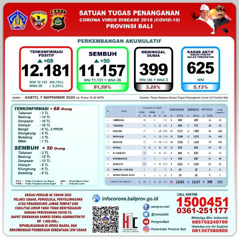 Terkonfirmasi Positif 12.181 orang,Sembuh 11.157 orang (91,59%), dan Meninggal Dunia 399 orang (3,28%).Kasus Aktif per hari ini menjadi 625 orang (5,13%), yang tersebar dalam perawatan di 17 RS rujukan, dan dikarantina di Bapelkesmas, UPT Nyitdah, Wisma Bima dan BPK Pering.