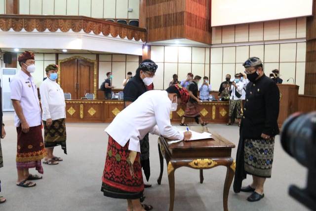 Serah terima nota pelaksanaan tugas dari Pejabat Sementara (Pjs) kepada Bupati Definitif dilaksanakan di Ruang Wiswa Sabha Utama Kantor Gubernur Bali, Sabtu (5/12/2020). Serah terima nota pelaksanaan tugas ini menandai berakhirnya masa tugas Pjs. Bupati Badung I Ketut Lihadnyana dan Pjs. Bupati Karangasem I Wayan Serinah yang masing-masing dikukuhkan pada tanggal 26 September 2020 dan 6 Oktober 2020.