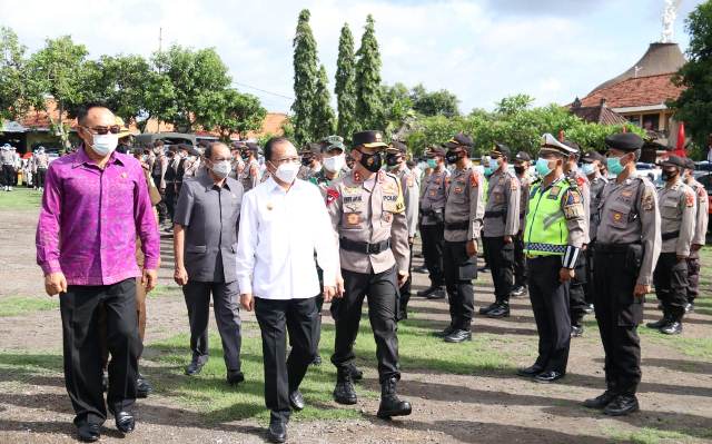 Apel dilakukan dengan penerapan protokol kesehatan yang ketat. Dalam apel ini Gubernur Koster melakukan cek pasukan berjalan kaki bersama Kapolda Bali dan Ketua DPRD Bali. Selain itu Gubernur juga melakukan penyematan pita tanda operasi kepada perwakilan pasukan.(rls)