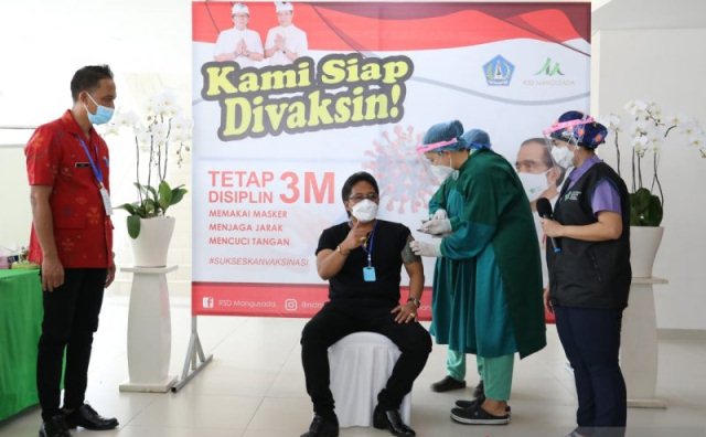 BADUNG, MEDIAPELANGI.com – Bupati Badung, Bali, I Nyoman Giri Prasta, menerima vaksin COVID-19 dosis kedua setelah 14 hari sebelumnya telah menerima suntikan vaksin COVID-19 produksi Sinovac dosis pertama.
