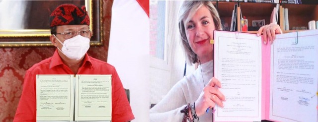 DENPASAR, MEDIAPELANGI.com – Gubernur Bali, Wayan Koster dan Christian Dior Couture, S.A secara resmi menandatangani kerjasama dalam mempromosikan Ekspresi Budaya Tradisional Indonesia untuk Tenun Endek Bali secara virtual dari Gedung Gajah, Jayasabha, Denpasar dan Paris, Perancis tepat pada Hari Suci Tilem Kaulu, Kamis, Wraspati Pon Landep (11/2) Pukul 21.30 WITA atau 14.30 waktu bagian Paris.