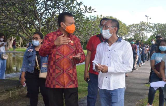 DENPASAR,MEDIAPELANGI.com – Sekretaris Daerah Provinsi Bali Dewa Made Indra pagi tadi kembali meninjau pelaksanaan vaksinasi bagi Pekerja Migran Indonesia (PMI) asal Bali, yang dilaksanakan di Taman Jepun, Denpasar Timur, Rabu (31/3/2021).