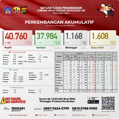 DENPASAR, MEDIAPELANGI.com – Update Penanggulangan Covid-19 terkonfirmasi sebanyak 187 orang (169 orang melalui Transmisi Lokal, 17 PPDN dan 1 PPLN)
