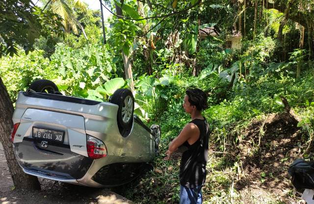 Namun, saat melintasi jalan turunan landai tiba-tiba mobil kehilangan kendali dan terguling di bahu jalan.