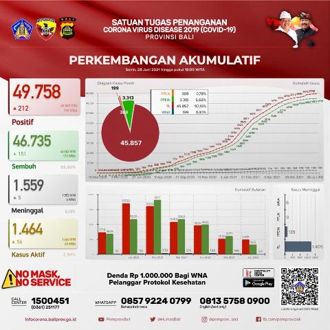 DENPASAR, MEDIAPELANGI.com – Update pertambahan kasus TERKONFIRMASI covid-19 sebanyak 212 orang (143 orang melalui Transmisi Lokal, 62 PPDN dan 7 PPLN), SEMBUH sebanyak 151 orang dan 5 pasien meninggal dunia.