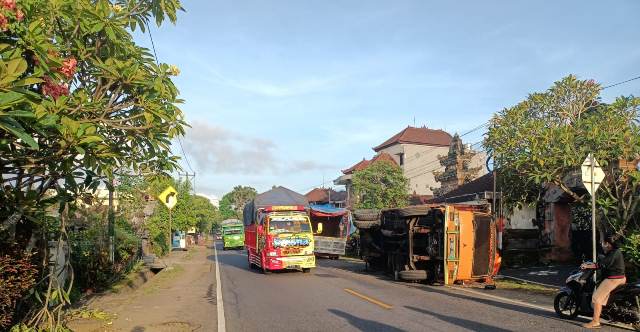 “Akibat terguling ini, truk mengalami kerusakan pada sisi kiri truk,” ujar Subagia.