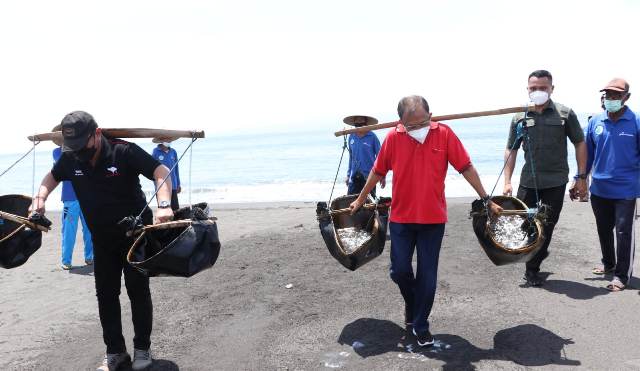 Saat kegiatan peninjauannya di Desa Kusamba, Gubernur Bali, Wayan Koster bersama Wakil Gubernur Bali, Cok Ace menyempatkan waktu menyiram ladang pasir dengan menggunakan air laut yang diangkut menggunakan alat tradisional timba.