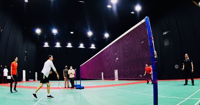 Bertanding di lapangan latihan, Presiden Jokowi tampak berpasangan dengan atlet tunggal putra, Jonathan Christie. Keduanya bertanding melawan Hendra Setiawan yang berduet dengan Ketua Umum Persatuan Bulu Tangkis Seluruh Indonesia (PBSI), Agung Firman Sampurna.