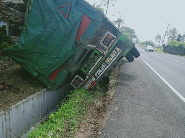 Akibatnya, truk yang dikemudikannya melewati jalan dan terperosok ke got. Roda depan dan belakang anjlok ke got hingga tak bisa bergerak.