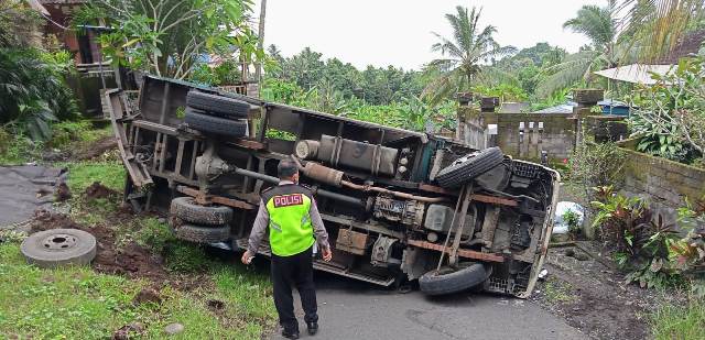 “Kejadiannya tiba-tiba as pendek patah truk langsung mundur dan terguling sampai muatannya tumpah ke jalan,” ujar Iptu Subagia.