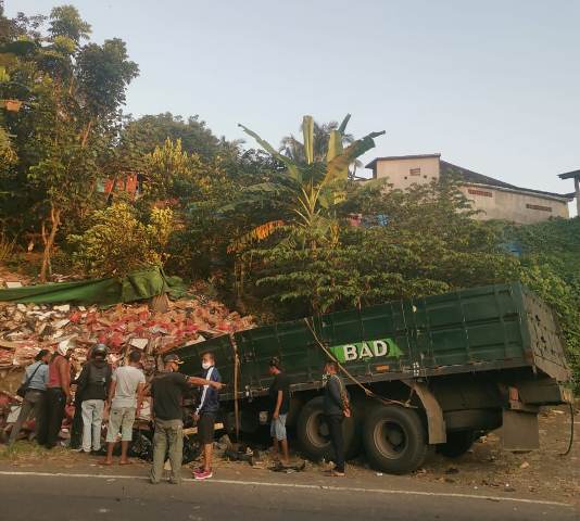 Diduga rem blong dan menghindari kendaraan di depanya sebuah truk muat keramik hilang kendali hingga menabrak pengendara motor hingga tewas lalu menabrak tebing jalan.
